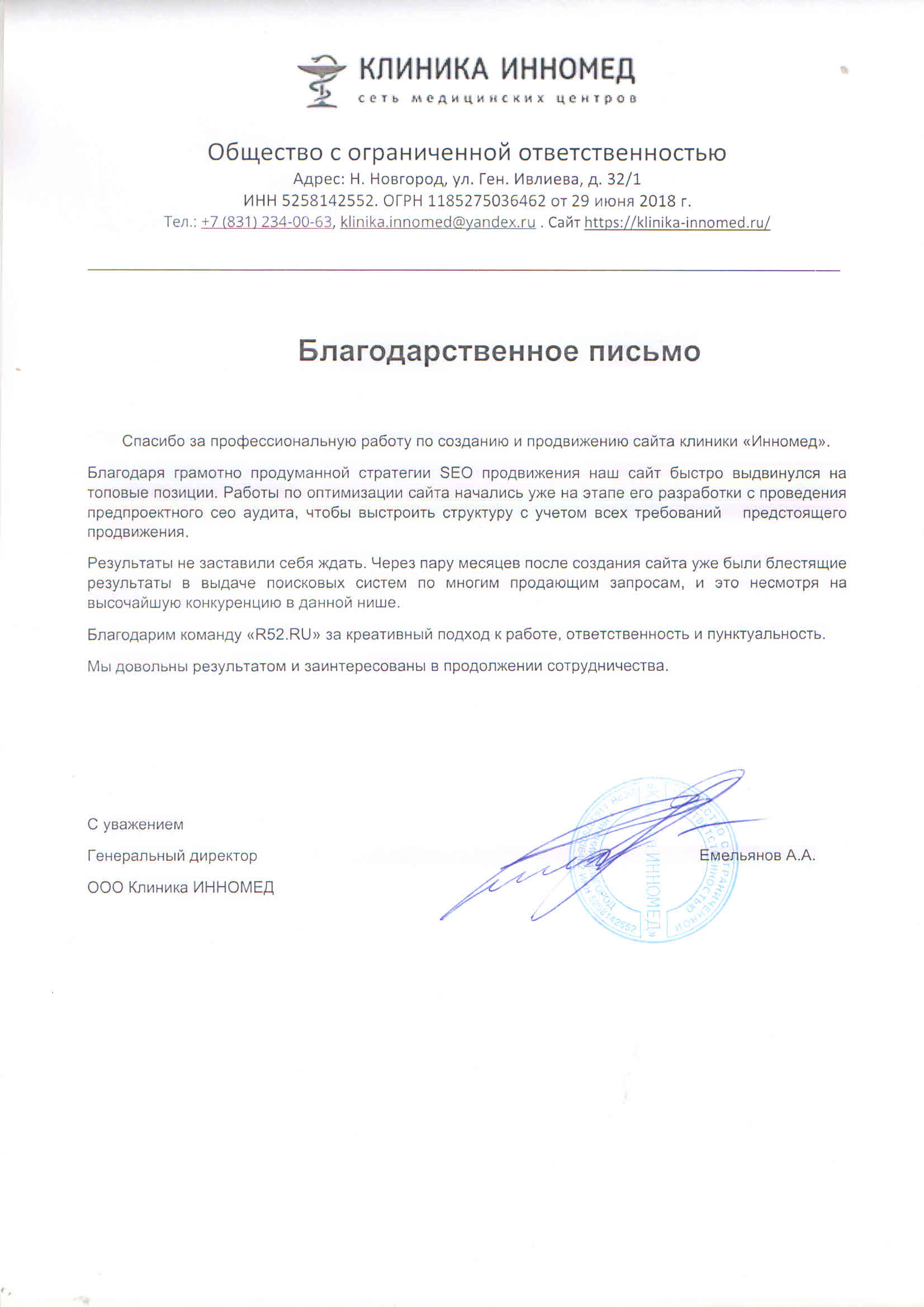 Спасибо за профессиональную работу по созданию и продвижению сайта клиники «Инномед».