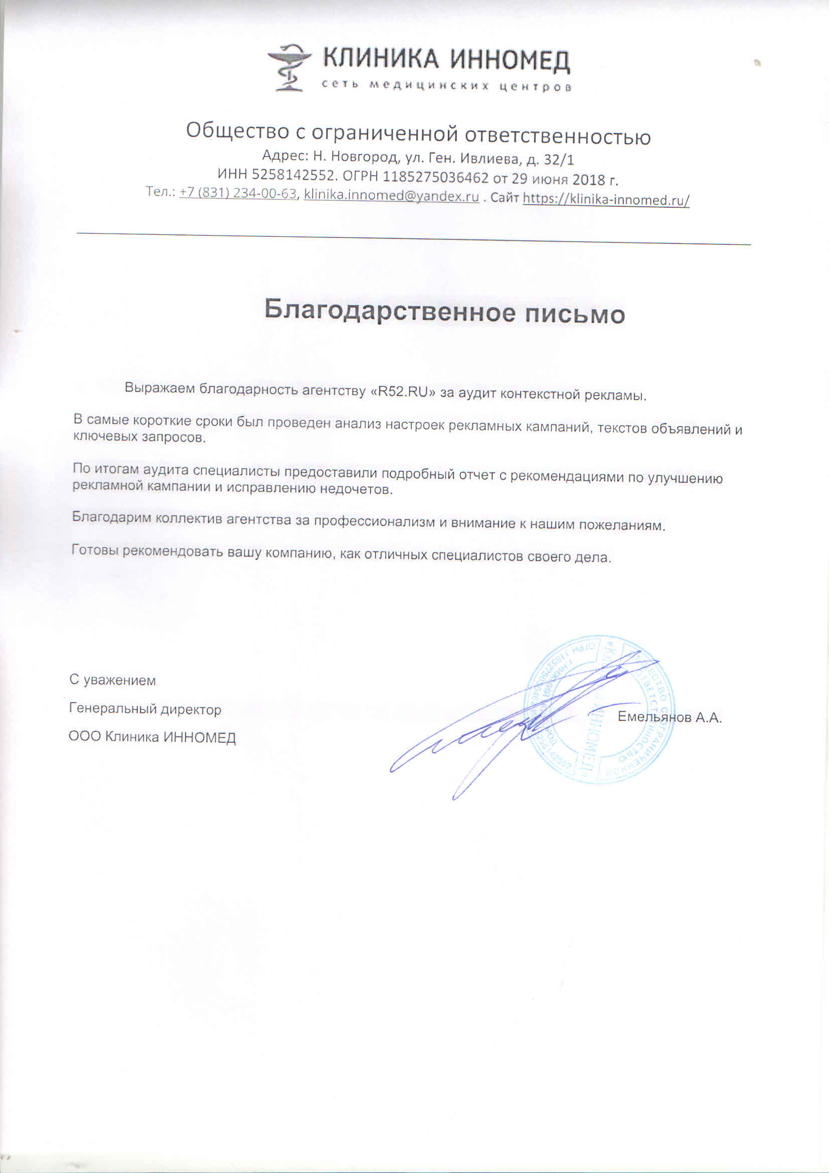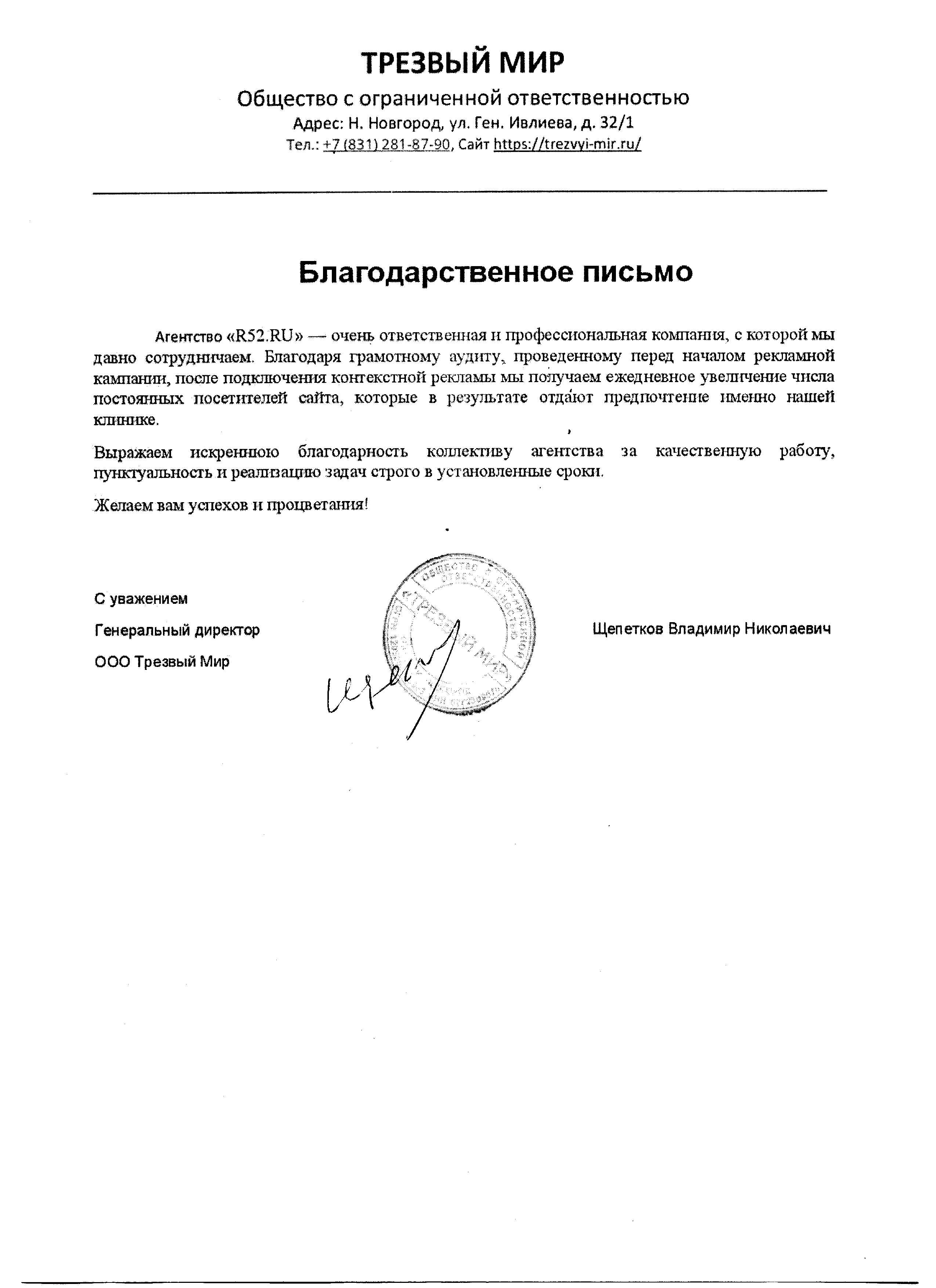 Выражаем благодарность агентству «Р52.РУ» за аудит контекстной рекламы. В самые короткие сроки был проведен анализ настроек рекламной компании, текстов объявлений и ключевых запросов. По итогам аудита специалисты предоставили подробный отчет с рекомендациями по улучшению рекламной кампании и исправлению недочетов.